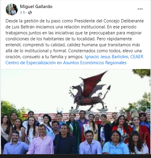Finalmente funcionarios y compañeros políticos de Bartolini expresaron su pesar por la muerte de Juan Ignacio Bartolini, recordando su labor como presidente del Concejo Deliberante y su compromiso con la localidad de Beltrán.