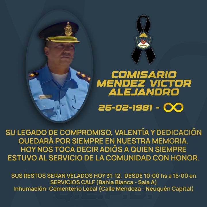 Conmoción en la Policía de Neuquén por la muerte de un comisario este miércoles 31 de diciembre. Se trata de Víctor Alejandro Méndez. «Su legado de compromiso, valentía y dedicación, quedará por siempre en nuestra memoria», manifestaron. Sus restos serán velados hoy.