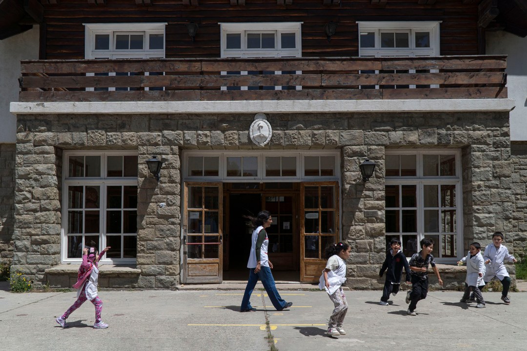La escuela ubicada sobre la costanera a metros del Nahuel Huapi forma parte de un conjunto de edificios públicos proyectados por Parques Nacionales en la década del 1940.