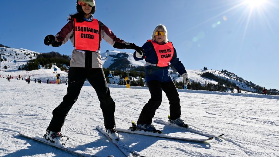 Decenas de esquiadores con pecheras naranja flúor sobresalían en la base del cerro Catedral ayer por la tarde, bajo un sol radiante, un termómetro que marcaba los 3 grados y una sensación térmica de 7 bajo cero. De repente, una pareja descendía tomada de la mano; a unos pocos metros, otros dos lo hacían sosteniendo un mismo bastón. En cada caso, uno de ellos tenía los ojos vendados. En la pechera se leía “Esquiador no vidente”.