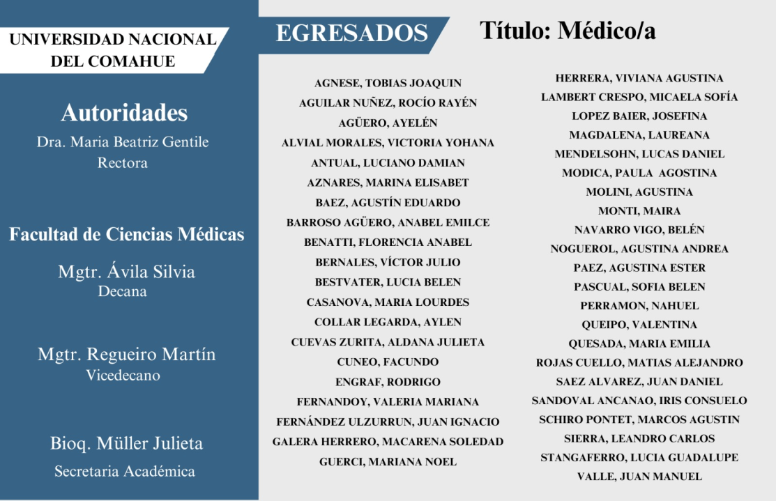 El acto estará presidido por la rectora de la Unco, Beatriz Gentile junto a la magister Silvia Ávila, decana de FACIMED, el magister Martin Regueiro Vicedecano de la facultad y la secretaria académica, bioquímica Julieta Müller.