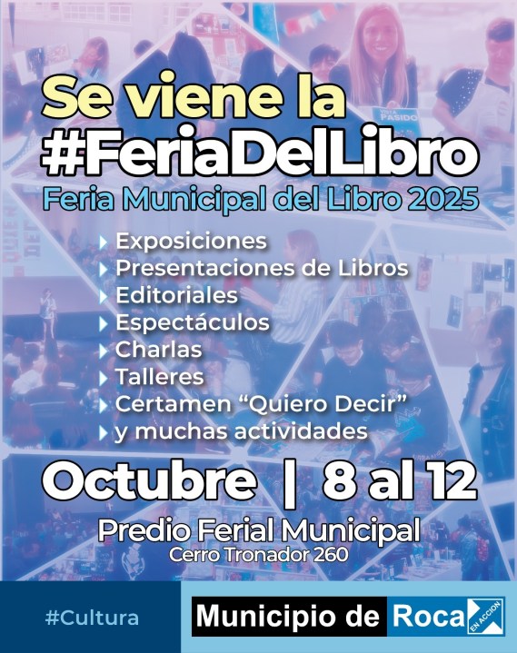 Uno de los eventos más esperados del año que congrega a gran cantidad de asistentes, ya tiene fecha. La 7° edición de la Feria del Libro organizada por el Municipio de Roca se acerca con la visita de figuras destacadas en el ámbito nacional.