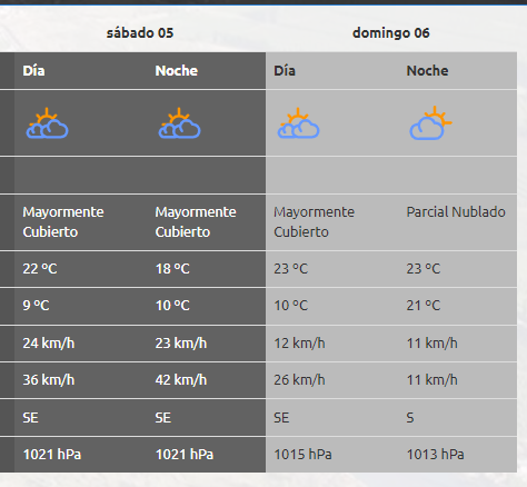Sobre el domingo, el pronóstico es similar, con temperaturas mínimas de 10°C con máximas de 23°C. El cielo permanecerá mayormente cubierto. El viento tendrá ráfagas de 30 km/h.