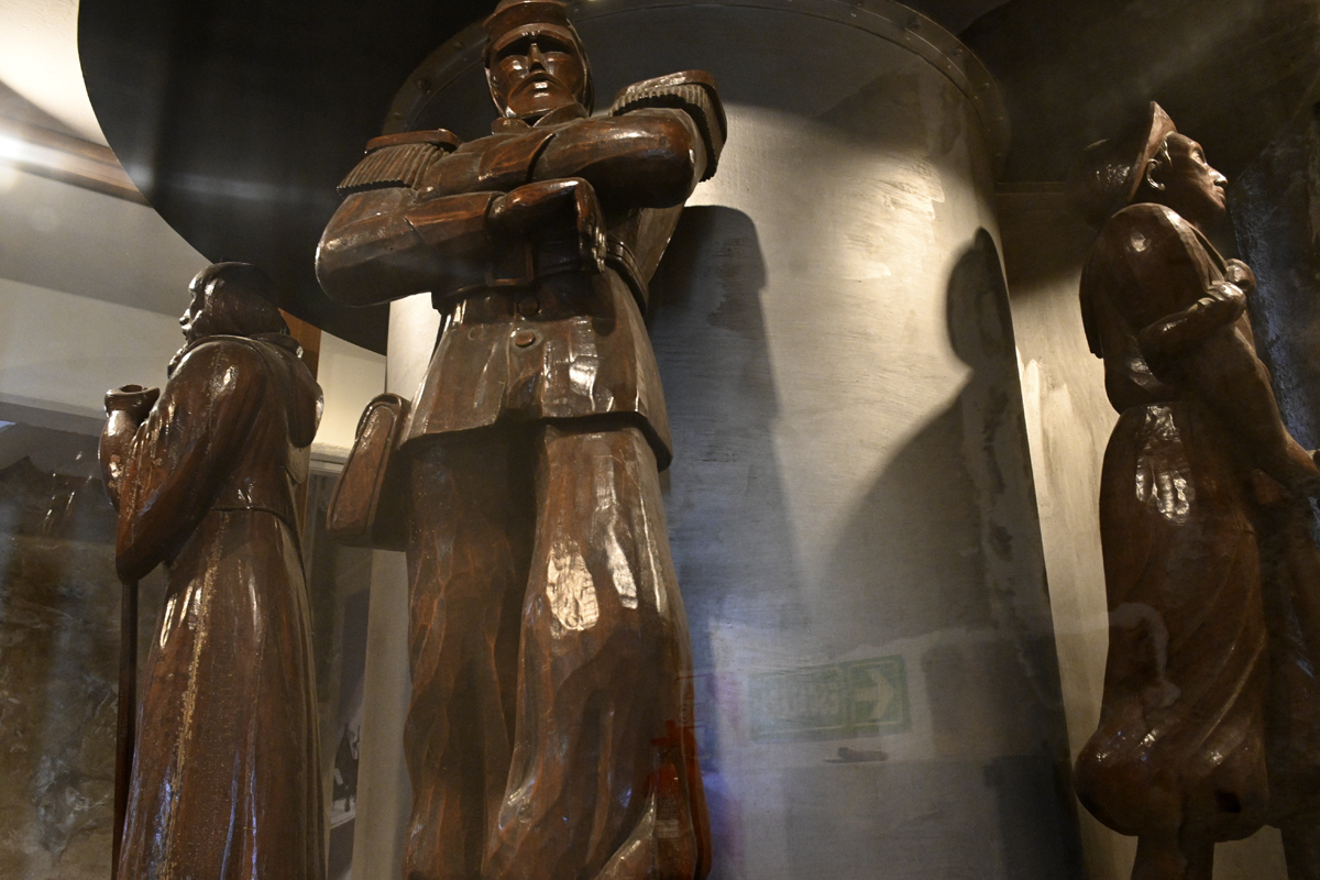 Estas esculturas representan a los pueblos originarios, al misionero, al soldado y al labrador, las diferentes identidades de la comunidad de Bariloche a comienzos del siglo XX.