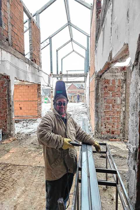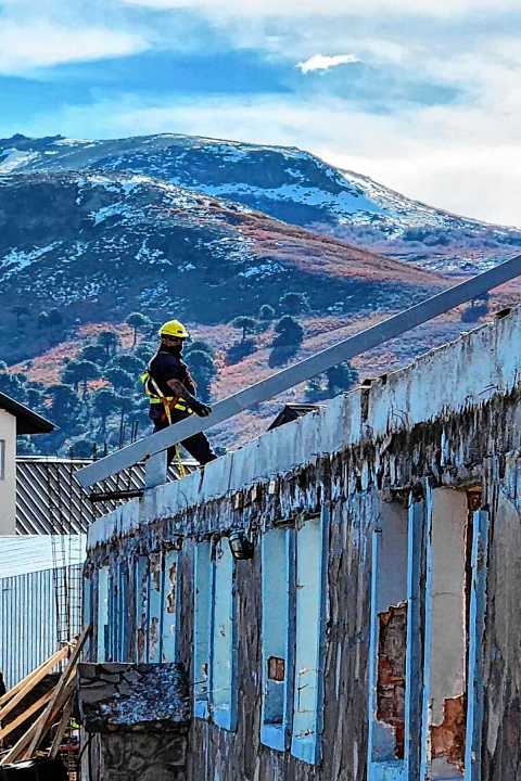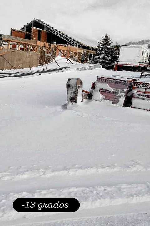 Adentro es entre las paredes que resistieron el fuego y las nuevas, bajo el 70% del techo que ya lograron instalar, entre los cañones que calefaccionan los materiales para que no se congelen. Es imprescindible el stock: si la nieve corta los caminos y los sorprende sin cemento, sin arena, sin hierro, sin chapas, sin todo lo que necesitan, se quedarían de brazos cruzados hasta que despeje. Y nadie quiere eso.