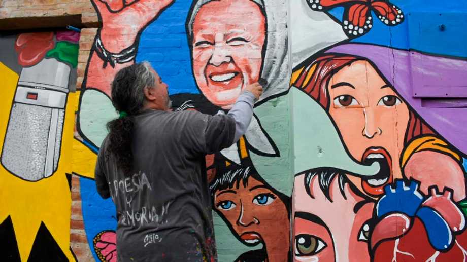 “Yo iba a pintar una madre de Plaza de Mayo que representara a todas, pero a partir de que falleció Norita me empezaron a preguntar ¿Tendría que estar Norita no?”, cuenta Chelo Candia. Lo pensó y decidió: ponerla como principal en la composición. Respetó el boceto original, pero le sumó a Norita. “La pusimos en el centro y el mural terminó siendo como un homenaje a Norita”, explica.