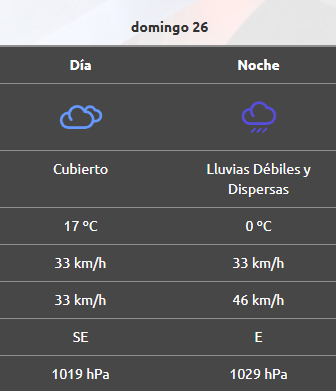 Según pronosticó la Autoridad Interjurisdiccional de Cuencas (AIC), en Neuquén capital y Cipolletti pronosticaron una jornada electoral nublada, con una máxima de 17°C, y una leve presencia del viento desde el sudeste con ráfagas de más de 30 km/h.