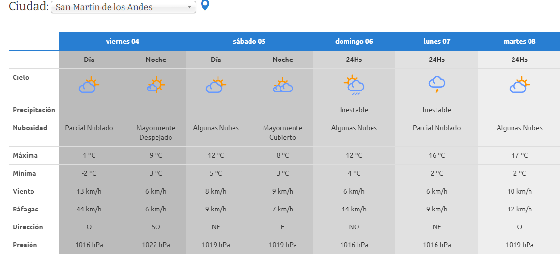 En Bariloche, la AIC pronosticó que estará inestable el domingo 6 de octubre. En tanto, en San Martín de los Andes, se esperan lluvias el último día del fin de semana y el lunes.