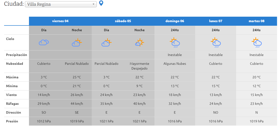 En tanto, en Roca, se esperan lluvias el domingo y el lunes, y en Villa Regina desde el 6 de octubre al martes.