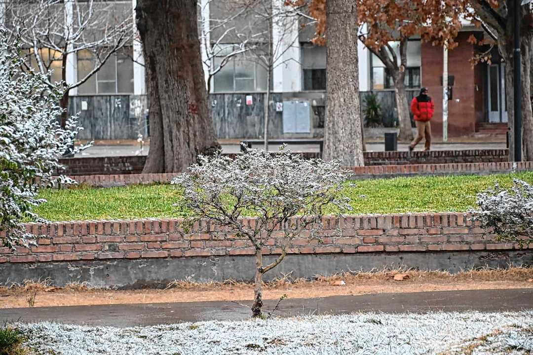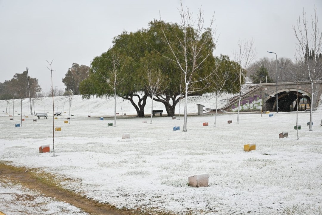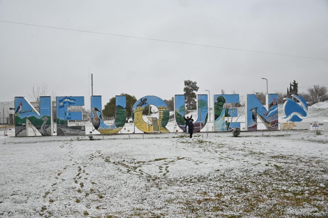 Del otro lado del puente, en Cipolletti, nevó y tiñó de blanco las plazas, parques y monumentos de la ciudad.