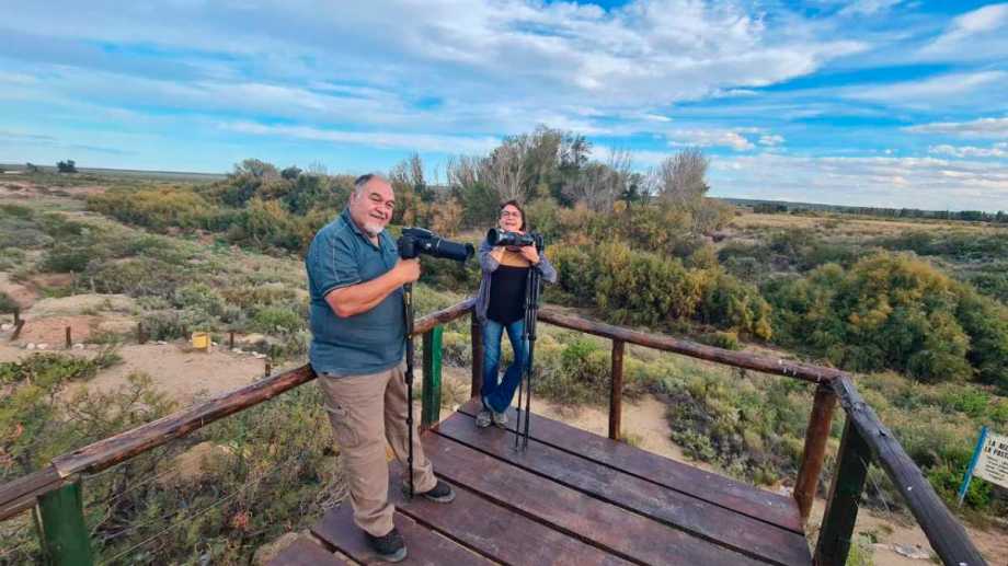 Las cámaras y los trípodes listos en una de las pasarelas de acceso en el paseo histórico La Pasto Verde es el lugar elegido para transmitir el entusiasmo por las aves de la zona. Mientras discurre la charla, Silvia De Otaño y César Echeverría -de ellos se trata- explican que las mejores temporadas para registrar aves es ésta, el otoño y la primavera porque “es el momento de las migraciones”.