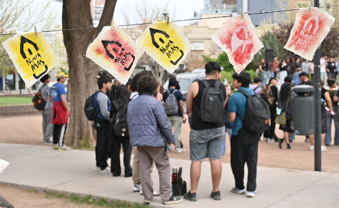Con la coordinación de la agrupación universitaria Jóvenes por la Memoria, las estudiantes leyeron conclusiones logradas en los talleres y en las aulas, mientras que después desplegaron en las diagonales de la plaza San Martín, poemas y escritos colgados en cordeles.