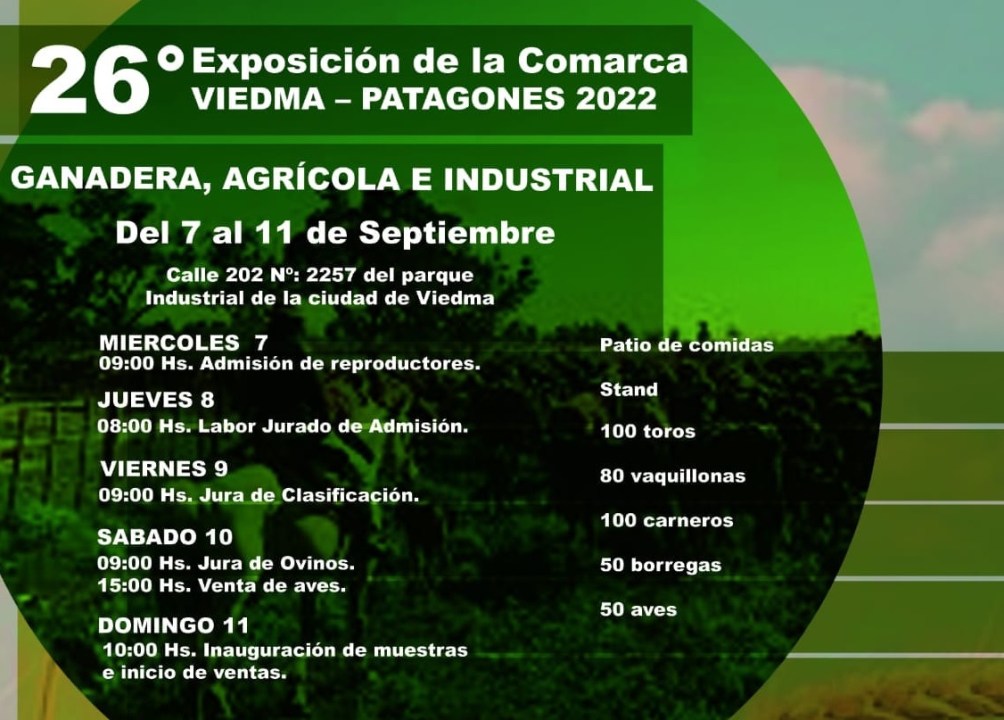 También se anunció que el predio de la Sociedad Rural de Viedma, ubicado en el Parque Industrial, contará con una variada gama de stands y habrá un patio de comidas.