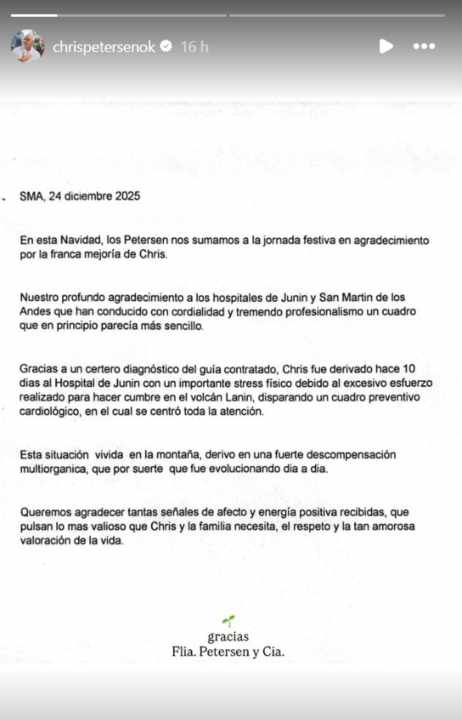 La familia expresó su «profundo agradecimiento» hacia ambas instituciones por la cordialidad y el profesionalismo demostrado para conducir un cuadro clínico que fue escalando en gravedad. Afortunadamente, informaron que la salud de Christian Petersen ha ido evolucionando día a día de manera favorable.