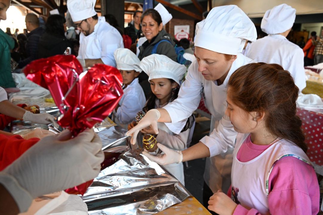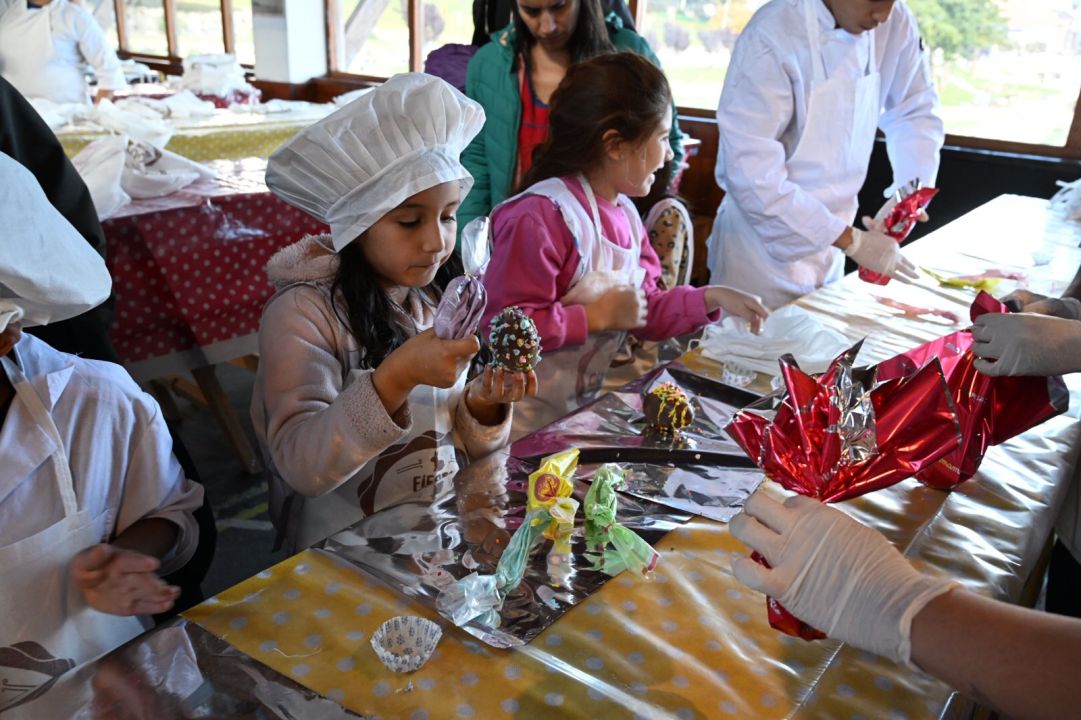 Las chocolaterías de Bariloche aportaron unos 1.500 huevos de chocolate que los chicos se llevaron a sus casas. Representan casi 200 kilos y cada huevito tiene 80 gramos. El ITS aportó las mangas de colores con glasé real con colorantes, grajeas, granas y minirocklets. En tanto, 50 estudiantes de gastronomía concurrieron a ayudar por la mañana y otros 50, por la tarde.