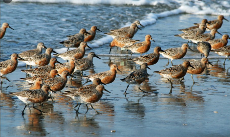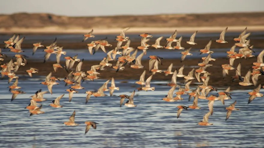 Los playeros rojizos (Calidris canutus rufa) llegan todos los años a partir de marzo al Área Natural Protegida Bahía de San Antonio.