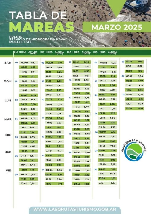 Según la tabla de mareas del Servicio de Hidrografía Naval que compartieron desde la dirección de Turismo de la localidad balnearia, la altura irá en descenso rondando la máxima los 8 metros.