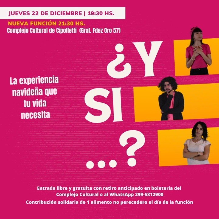 El Complejo Cultural Cipolletti (CCC) abre sus puertas para continuar con el espíritu navideño en la ciudad. Esta vez llega el turno de la obra "¿Y si...?", que propone imaginar como seria Jesús si hubiera nacido en diferentes eras de la historia humana.