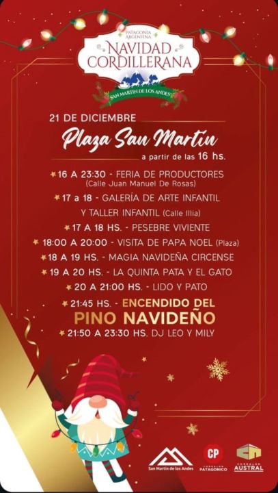 La navidad en San Martin de los Andes comenzará a partir de las 16 hasta las 00. La jornada contará con una extensa grilla de espectáculos, música y actividades con motivo navideño: