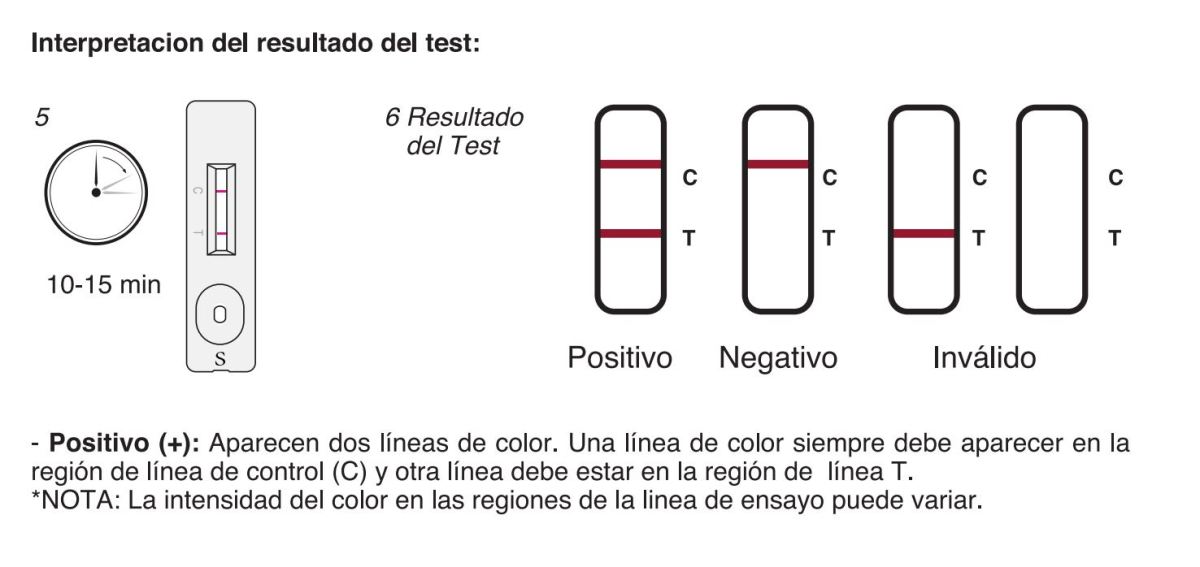 – Leer en unos 15-20 minutos de acuerdo con cada test. Si aparecen dos líneas el resultado es positivo (C Y T). Si aparece solo una línea el resultado es negativo (C), la línea control indica que el test funciona correctamente.