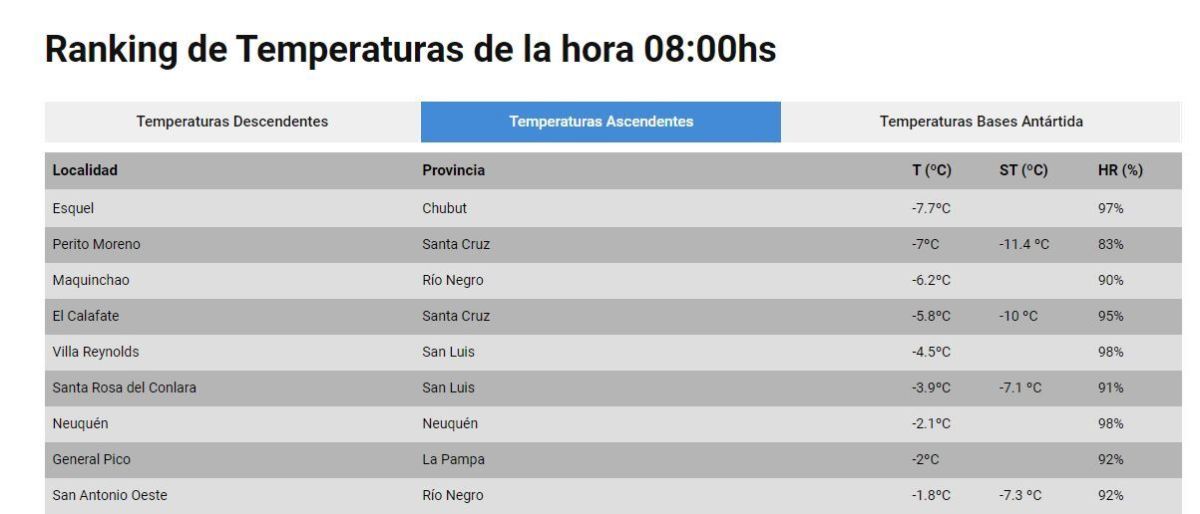 En séptima posición aparece Neuquén capital con -2,1ºC, y más adelante, San Antonio Oeste con -1,8ºC y una sensación térmica de -7,3ºC.