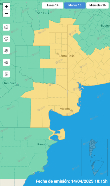 En Río Negro las zonas alcanzadas por la advertencia son: Avellaneda, Pichi Mahuida, Conesa, la Meseta de Adolfo Alsina, la Meseta de San Antonio y Valcheta. El momento más delicado será durante la mañana del martes, cuando se prevén las precipitaciones más intensas.