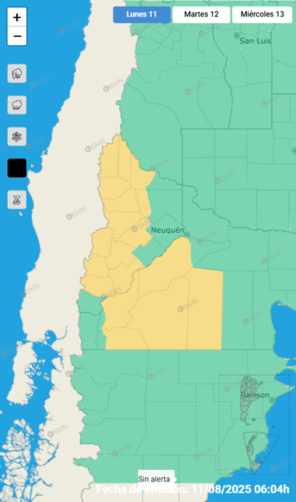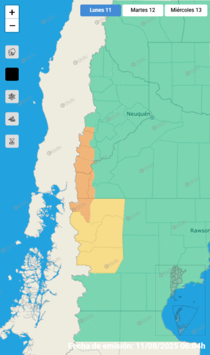 En cuanto a la provincia neuquina, hay alerta naranja durante toda la jornada, que se podría extender hasta la mañana de este martes 12 de agosto. En esta ocasión afectará en: Huiliches, Lácar, Aluminé y Los Lagos.