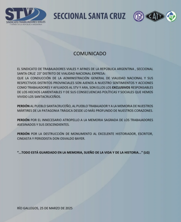Por su parte, desde la seccional de Santa Cruz del Sindicato de Trabajadores Viales también apuntaron contra la demolición del monumento.