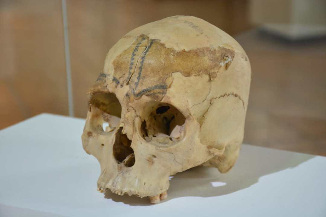 En el buceo sobre el pasado hay un cráneo que se exhibe en este sitio que tiene una singularidad: está tatuada con un motivo encadenado y en su base hay un punzón. Fue hallada en aleros del Chocón y tiene una antigüedad de entre 2.600 y 3.000 años. ¿Porqué tatuar una calavera? es una pregunta del pasado que interpela al presente.