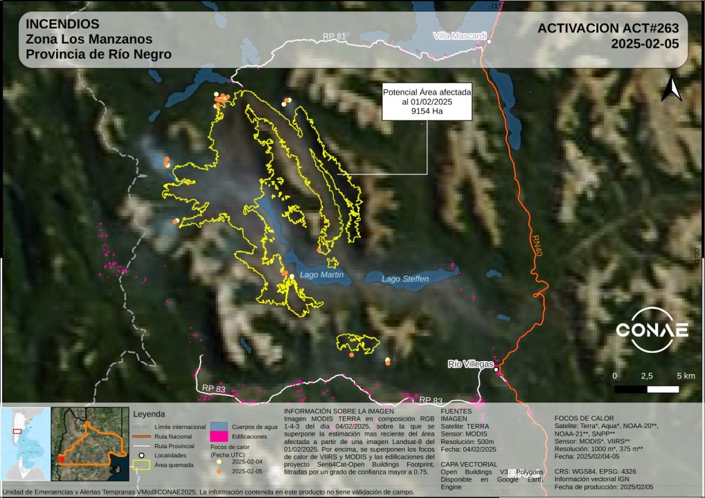 En este momento, la Conae está monitoreando cinco grandes incendios en la franja que limita con Chile, desde Neuquén hasta Chubut. «Tenemos incendios en Pino Machado, Cuenca del Lago Tromen, Los Manzanos, El Bolsón y Atilio Viglione y cerca de Río Pico», expuso el coordinador de la Unidad de Emergencias y Alertas Tempranas de la Conae, Andres Lighezzolo.