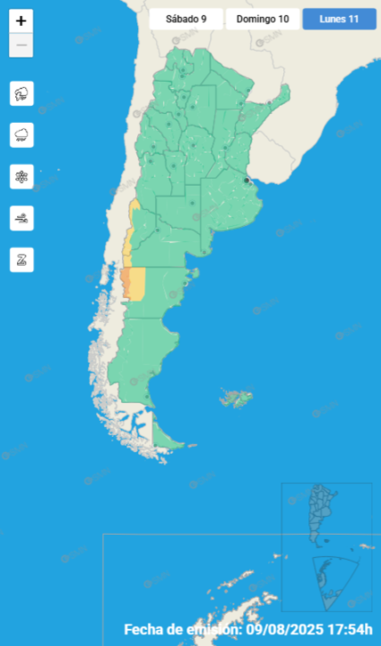 Por su parte, en las localidades cordilleranas neuquinas de Huiliches, Lácar, Aluminé, Chos Malal, Loncopué, Minas, Picunches y Ñorquín la lluvia llegará en horas de la tarde y permanecerán hasta la noche del lunes.