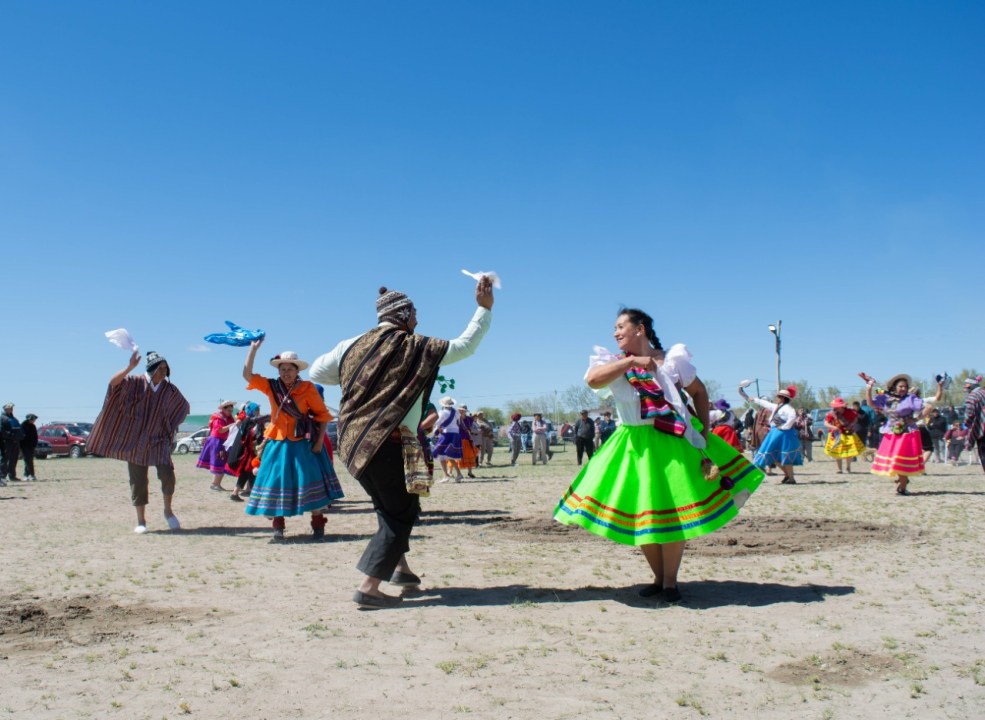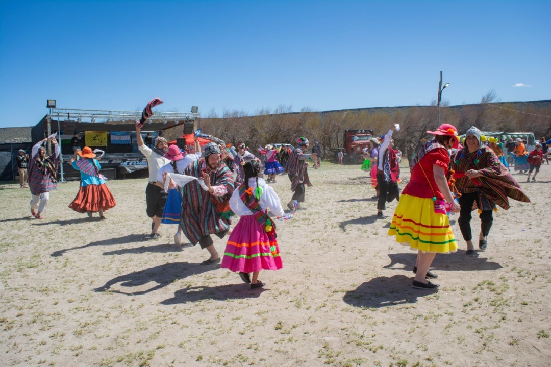 Cuando nombraron al grupo, se escuchó la música de carnaval y de a poco se fueron asomando como fuera la puna en Jujuy pero en El Cuy los bailarines con sus ropas de colores.
