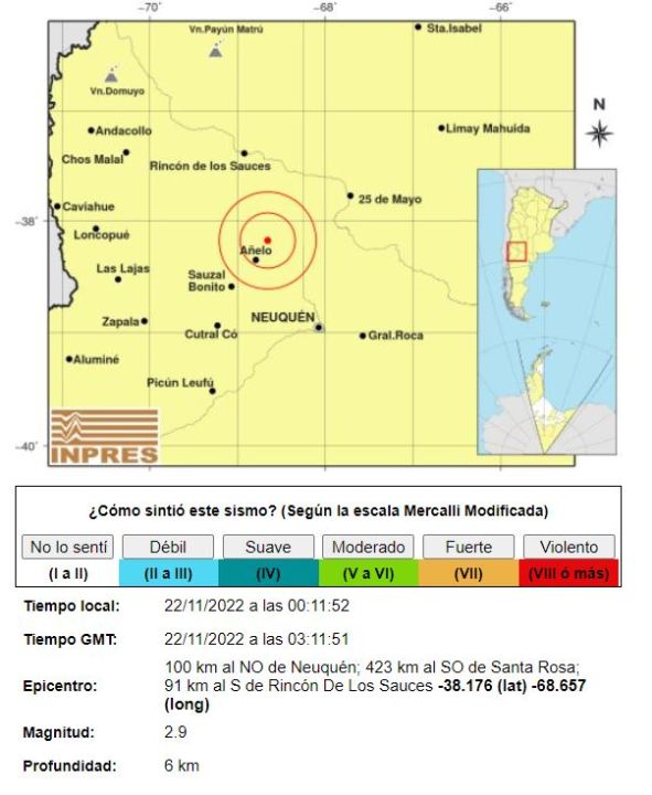 El Instituto Nacional de Prevención Sísmica (Inpres) informó que el temblor de hoy sucedió a las 00.11, al noreste de Añelo. Tuvo una magnitud de 2.9 grados en la escala de medición.