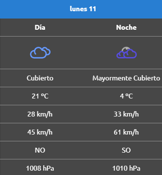 El viento soplará del noroeste a 28 km/h, con ráfagas que llegarán a los 45 km/h durante el día y se intensificarán hacia la noche, alcanzando los 61 km/h. El cielo mayormente cubierto reducirá la amplitud térmica.