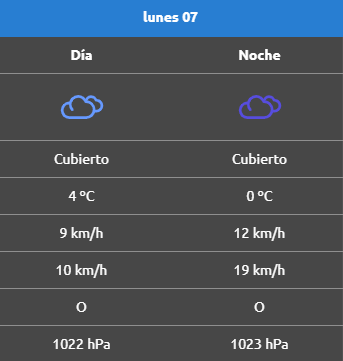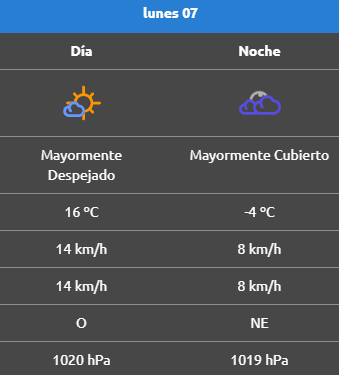 Luego de un domingo con nevadas débiles, no se esperan nuevas precipitaciones, aunque las nubes persistirán. El viento soplará con velocidades leves, entre 9 y 12 km/h, con ráfagas que podrían llegar a 19 km/h desde el oeste.