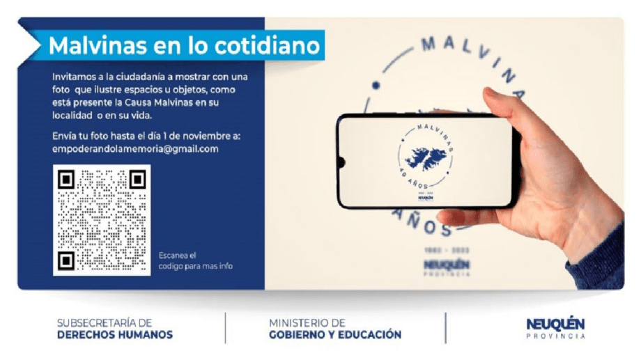 Por los 40 años de la Guerra de Malvinas, la Subsecretaría de Derechos Humanos de Neuquén invitó a participar de la convocatoria fotográfica «Malvinas en lo cotidiano». La consigna es capturar en una foto algún espacio u objeto que sea capaz de mostrar cómo está presente la Causa Malvinas en su localidad o vida.