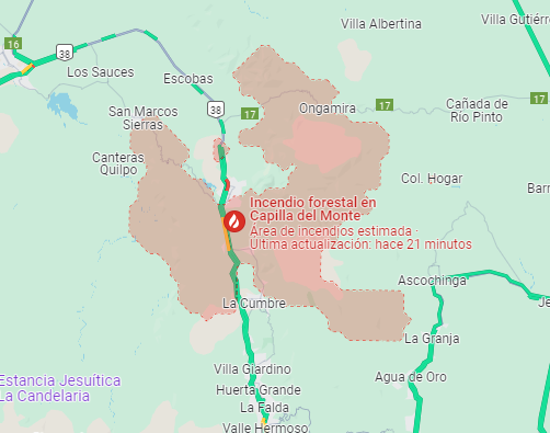 También hay otro incendio en Capilla del Monte que se dividió en dos: una parte hacia el oeste, para San Marcos Sierras, y el otro para Sierras Chicas, que en este momento tiene la cabeza al norte de La Granja.