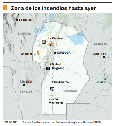 Continúa el combate contra el fuego en la provincia de Córdoba. Según información oficial siguen activos cuatro focos. La situación es tan crítica que se sumaron brigadistas de la Comarca Andina a las tareas en el monte.