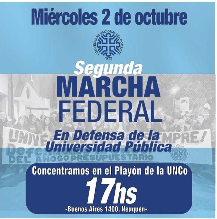 Este miércoles 2 de octubre será la marcha federal universitaria en Neuquén en apoyo a la ley de Financiamiento Universitario, en contra del veto que anunció el gobierno de Javier Milei y en rechazo al presupuesto 2025. Distintos gremios anunciaron que se sumarán a la movilización de esta tarde en el centro de la capital provincial. Estos serán los horarios y el recorrido.