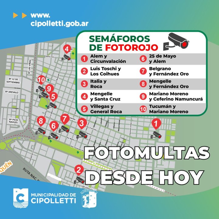 Los 10 puntos donde se encuentran las cámaras «Foto Rojo» en Cipolletti son: