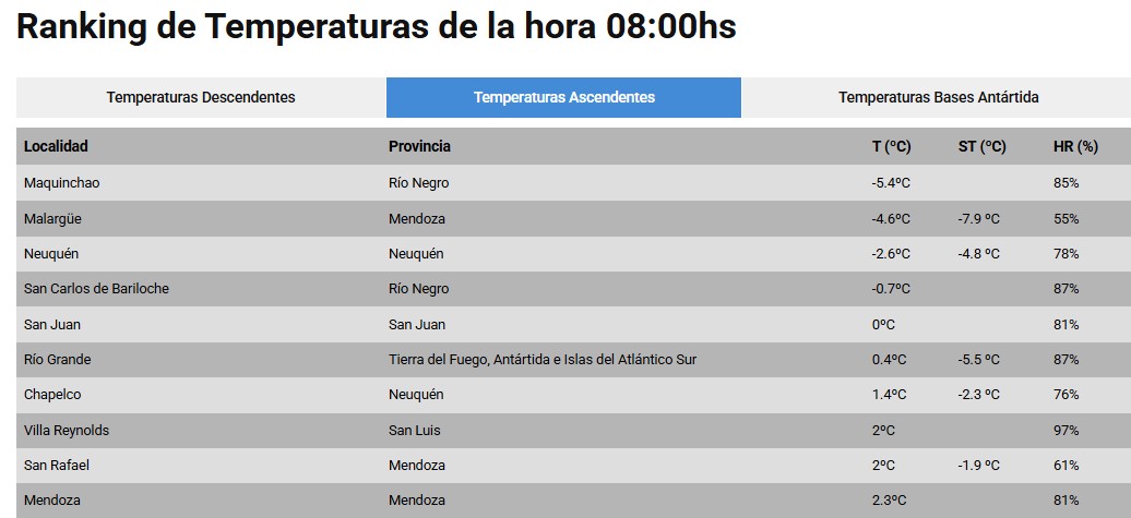 Según el reporte que difundió el SMN, a las 8 de este sábado, Maquinchao está en la primera posición con -5.4°C. Le sigue Malargüe, con registros en la localidad mendocina de -4.6°C (y una sensación térmica de -7.9 °C). En tercer lugar se ubicó Neuquén capital con -2.6°C (-4.8 °C de sensación térmica).