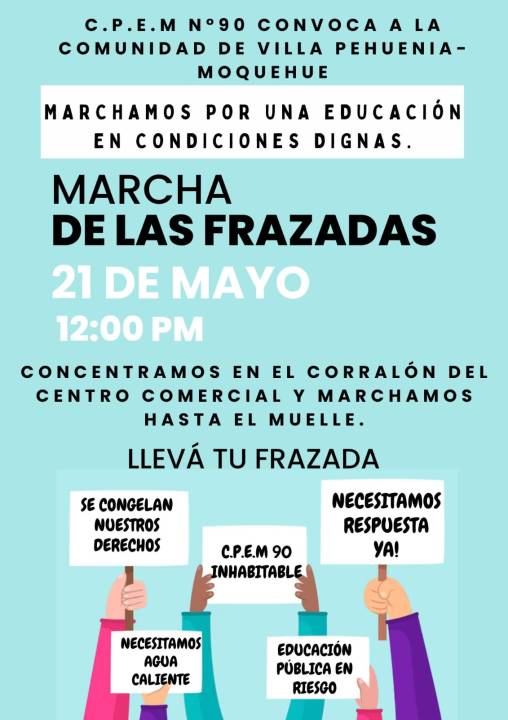 La protesta convoca a reunirse este martes en «el corralón del centro comercial» para luego marchar hasta el muelle al mediodía. Según difundieron será una «marcha de las frazadas» para pedir una educación en condiciones dignas.