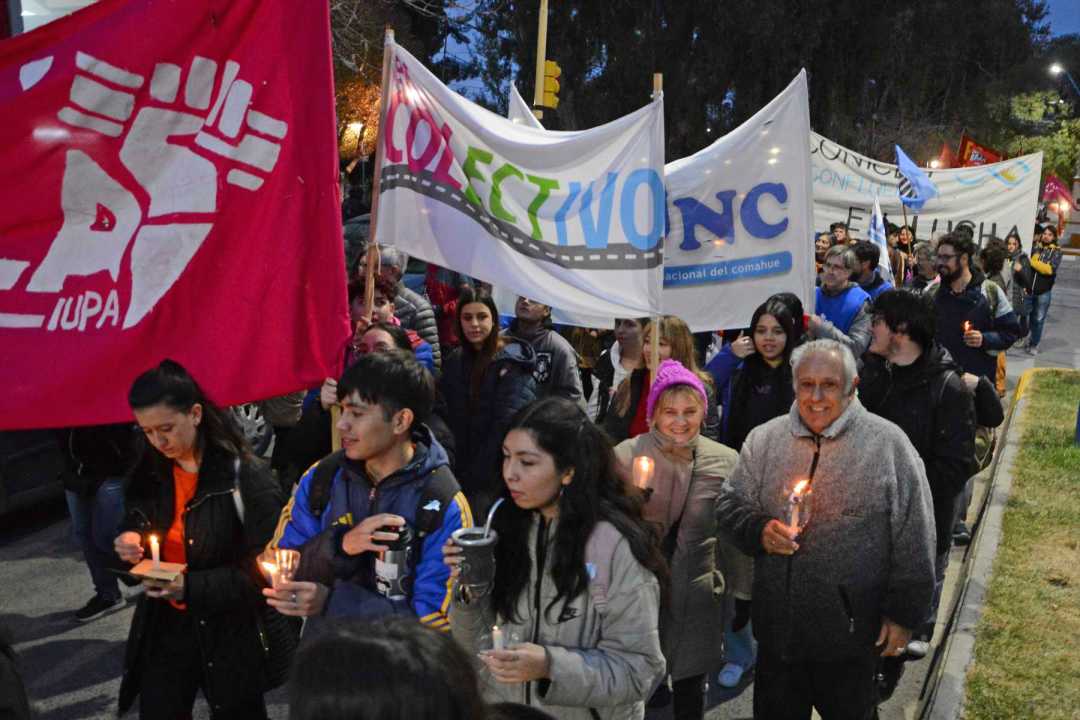 Al igual que en otras localidades de Río Negro, en la ciudad capital la comunidad educativa se convocó para llevar a cabo una marcha de antorcha en defensa de la universidad pública y en contra del ajuste de Milei.