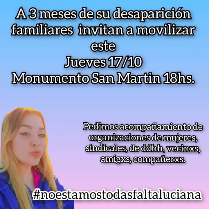 Familiares, allegados y agrupaciones convocaron a la comunidad a marchar este jueves 17 de octubre en Neuquén para exigir la aparición de Luciana Muñoz, la joven 20 años de la que nada se sabe desde el pasado 13 de julio, cuando salió para visitar a un amigo.
