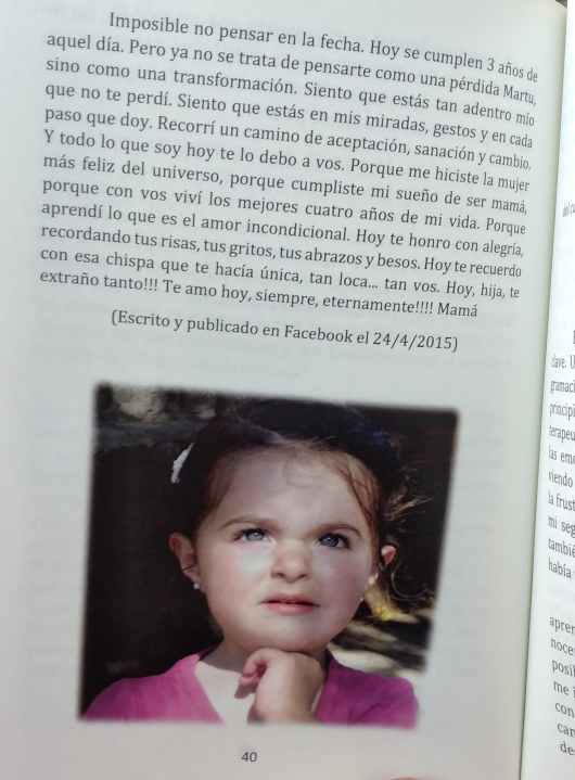 “El subtítulo es La muerte y el dolor, como impulsores de la vida. Empecé a escribirlo cuando logré hacer el proceso de duelo y la sanación. No sólo venía de la muerte de Martina sino de la pérdida de varios embarazos. El último fue en 2013, al año siguiente del accidente. Ahí fue cuando decidí hacer una terapia más profunda”, reconoció. Acudió a una terapia comunicacional “que viene de la mano del coaching y la programación neurolingüística.