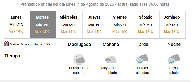 Según indica el SMN, este martes también será un día marcado por la lluvia en Roca. Para la jornada se esperan temperaturas que oscilará entre los 3°C y los 13°C.