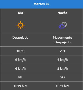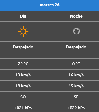 Durante la tarde, la máxima alcanzará los 22 °C, mientras que hacia la noche se prevé un descenso hasta los 0 °C, manteniendo la posibilidad de heladas en áreas rurales y bajas. El viento soplará del sudoeste, con velocidades moderadas cercanas a los 13 km/h y ráfagas que podrían llegar a los 18 km/h.