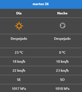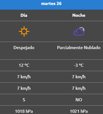Durante el día, los registros alcanzarán los 23 °C, mientras que hacia la noche se prevé un descenso hasta los 0 °C, con heladas débiles en sectores bajos. El viento soplará desde el sureste, con una intensidad moderada de alrededor de 18 km/h y ráfagas que podrían llegar a los 22 km/h.