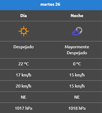 Durante el día, los termómetros alcanzarán los 22 °C, mientras que por la noche se prevé un descenso hasta los 0 °C. El viento soplará desde el noreste, con una intensidad moderada que rondará los 17 km/h, acompañado por ráfagas que podrían llegar a los 20 km/h.
