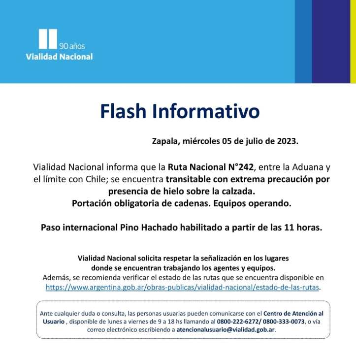 Por el cierre del paso internacional Pino Hachado habían más de 100 camiones varados entre Las Lajas y Zapala. Esto fue porque hubo intensas nevadas. Finalmente hoy, a las 11, se rehabilito la circulación.